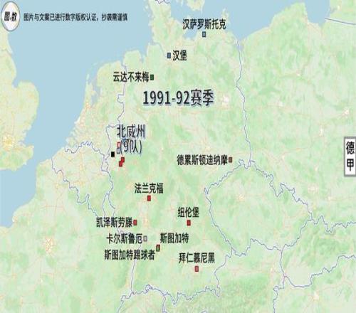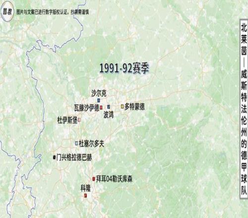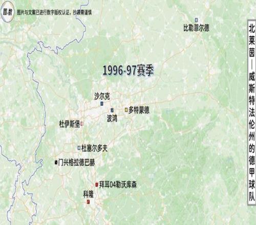 即使是德國統一后,北威州也曾兩次同時擁有9支德甲球隊:一次是在1991-92賽季,當時的德甲為照顧東德,臨時擴充為20隊;另一次是在已經恢復18隊的1996-97賽季,北威州的9隊是真正占據了德甲的“半壁江山”。