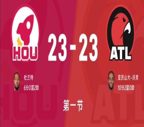比賽開始老鷹先攻,基斯珀特突破上籃、沃克三分,火箭這邊前3次進攻都沒有得分,沃克一個拜佛輕松點飛申京上了一次空籃7-0開局,9分55秒火箭還沒有得分烏度卡喊出暫停。重回比賽杜蘭特罰球線跳投解決問題,沃克突破內線上籃造成申京犯規兩罰全中,老鷹這防守轉換打得真不錯,火箭陣地戰防守優勢完全發揮不出來。回過來申京內線打成稍稍找回面子,奧科吉三分也開了比分追到7-9,史密斯也試試三分不中回過來沃克底角三分機會把握住了,阿門利用節奏騙得兩次罰球機會。中單雙方慢慢開始輪換陣容,火箭一度將比分追到14平,但是老鷹連續轉換一波7-2重新領先5分,CJ替補上來狀態火箭3投3中幫助老鷹23-18進入暫停。比賽繼續首節比賽還剩2分45秒,雙方上來連續打鐵誰也無法得分,合阿門內線打成一球,泰特轉換三分命中追成23分結束首節!