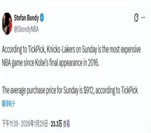 據票務平臺Gametime的數據顯示,湖人和尼克斯這場比賽的平均票價已高達912美元,這是自2016年4月13日科比退役之戰(當時平均票價為1049美元)以來,NBA常規賽票價的最高紀錄。而這場比賽的最低入場票價也達到了457美元。